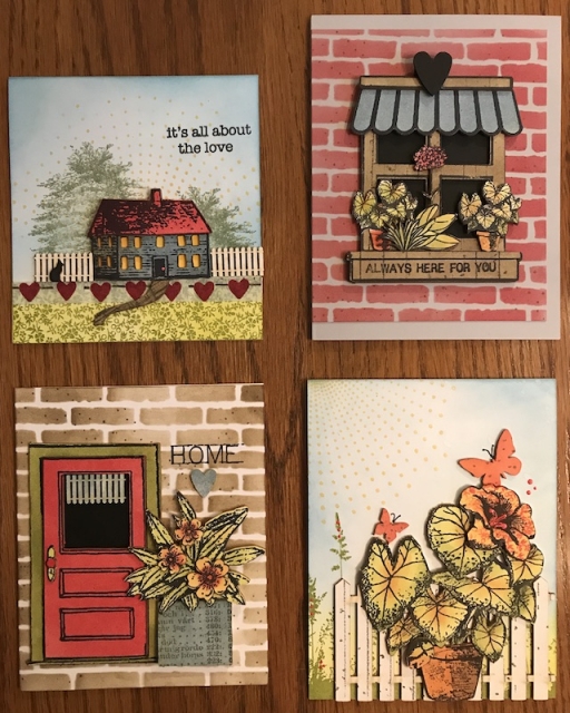 We used Wendy's blendable dye inks, archival inks, enamel accents (on door handle and large leafy pot card), mat minis, washi tape, stamps and stencils, Perfect Paper adhesive and Perfect Cardstock. It was a good opportunity to try out all of her products. I really like her colors and style. I'm happy with my cards. They were still lying on the dining room table tonight after I photographed them. DH saw them on his way out the door and he was impressed! His fave is the window, but then he said he liked them all. I bought the Art from Home set (house/trees) a month or so ago at LSS. At the show, I bought 2 packages of mat minis that match this stamp set and 2 packages of the picket fences. The fences come in assorted sizes., I think they will work well with lots of projects and stamps. We also used them as a valance on the door. Jan gifted me with a Garden Patina blendable ink. I bought the Sunshine blendable as we used it to brighten some of the flowers and leaves. I also picked up enamel accents in Sunflower and Carnation Red. I really like the card with the large pot and butterflies. They look like caladiums to me and remind me of Dad. Every summer Mom and Dad would go to the middle of the state (FL) in August, hot, hot, hot, and buy caladium bulbs. Many years he even planted them for me. They are still coming up in my pots. I move them from the side of the house to the front when they are standing tall! I will put that set on my wish list!