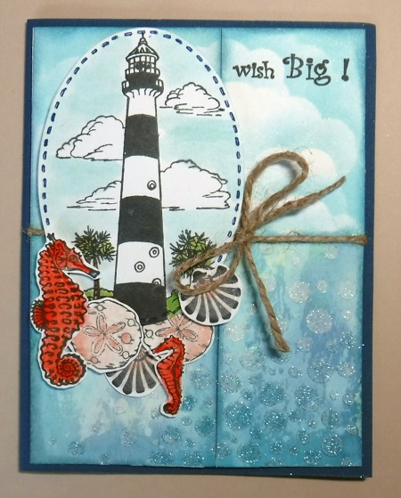 I cut 4 panels for the background. Used 2 stencils - clouds and bubbles. Colored with colored pencils, alcohol markers and watercolor. Lighthouse, some shells and seahorses are popped up. Used embosing paste and glitter on bubbles. All stamps are from Just For Fun.