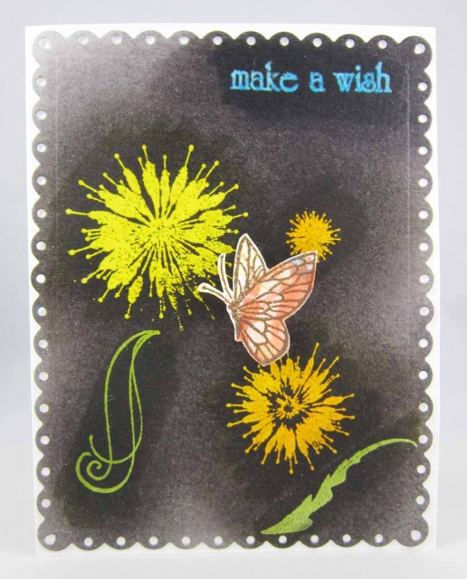 Stampendous- Daisy Thanks stamp for butterfly on old background from our previous fests, fussy cut