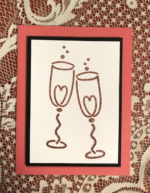 Tonight I finally made it in to a card. Stamped "Happy Anniversary" inside with a little heart above it, filled in with a Spectrum glitter brush marker. The focal piece was adhered to a black layer then mounted to the card with foam tape.