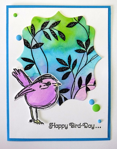 I had to use one of my backgrounds that we made in the zoom meeting! I cut it out using this shape from Sizzix. I used my very favorite bird from Dina Wakley. I waatercolored it using Distress ink, fussy cut it and added it to the card. The saying is from Stampendous.
