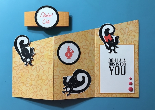 Stamps : Elizabeth Craft Design Ooh Lala sentiment, Stampin' Up 2006 Stinkin' Cute set, SU 2007 Polka Dot background stamped in Versamark on middle back panel.