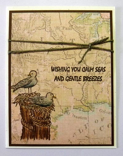 I found a map patterned paper and stamped the birds from Just For Fun. I colored the image with colored pencils and Gamsol. The saying is also from Just For Fun. I decided to make a male card. I have not made a male card in awhile.
