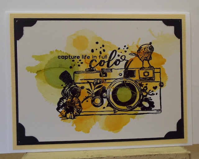 Made this card for a friend who is into photography. Stamp: Picket Fence. Stamped image on glossy CS that I made using alcohol inks. Thought the photo corners were a good addition with the camera image. TFL