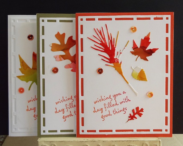 Set 0f 3 Thanksgiving Cards, die cutting various leaves from an alcohol ink piece I made. Adhered to die cut framed piece, and stamped quote on each one. Embellished with sequins. Adhered two of the frame panels to orange and green CS, and adhered one to white CS panel. Leaves: Sizzix - Tim Holtz. Frame: Penny Black. Quote: Hero Arts. Stamped Happy Thanksgiving inside each card. TFL.