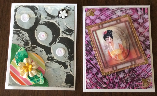 Neat cards! I like the way you stayed with the circle theme for the card on the left. Nice placement of embellishments. The one on the right makes a great background for your fancy framed image. I like the fans as embellishments.