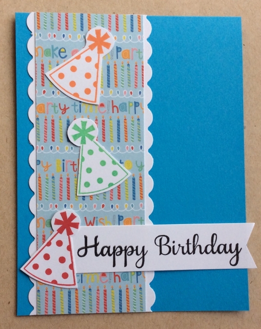 Stamped hats and fussy cut. Cut a strip of 2 inch by 5.25 inch patterned paper. Punched white cardstock and applied border to back of pp with double stick tape on both sides. Applied panel to card base.