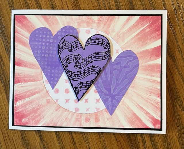 Purple hearts are glossy paper inked with Wilted Violet distress. One stamped. Two stenciled (Elizabeth Craft Design stencils) using hand sanitizer to lift some ink. I stamped on the back side of the glossy paper to get a pattern for where to cut them out to match the stamped heart.
