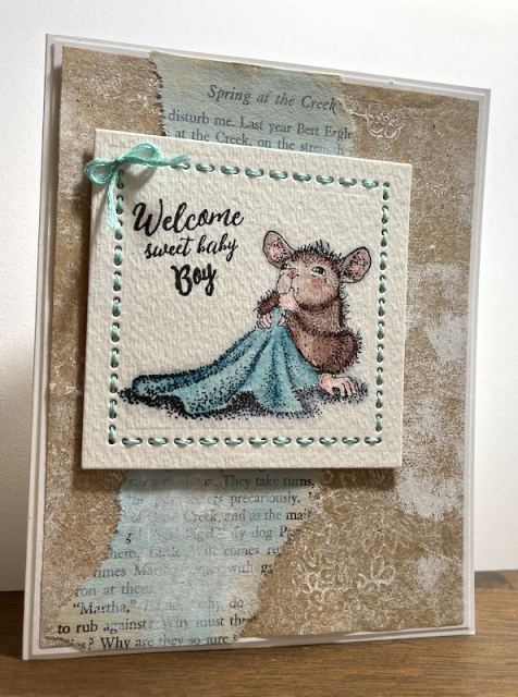 I cut a piece from a brown paper bag I got when I shopped at my LSS. I tried to stamp it in white with a lacy background stamp but my inkpad was dry so I tried white acrylic paint and that was only so so. I brayered a little bit of whte over that to add more white. I added blue paint to a gel plate to use as a palette and picked it up with the book paper. I felt I had a little too much blue and wiped off what I could with a baby wipe, added a tiny bit of white paint to my gel plate and printed that over the blue. The brown paper bag layer was diecut with Wonky Stitches and added to a white layer and then to the white card front.