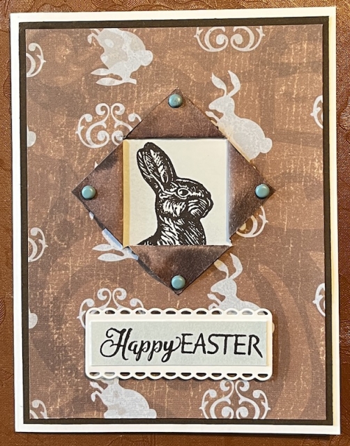 I love that old SU woodblock chocolate bunny stamp! I stamped the full bunny again on the inside of the card. Fun to use old paper I've been saving too, Rusty Pickle, and brads again!