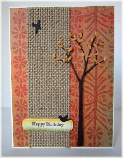 Beautiful fall birthday card! I love that background paper with the burlap, You must be really patient gluing those tiny leaves and birds!
