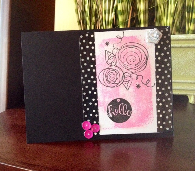 I used 2 ink pads for this one. I inked up the lids of 2 cases( Stampabilities pigment ink in hot pink and light pink) I uploaded a previous pic of this with my experiments. I fist stamped the light pink down, then the hot pink. I was hoping they might blend a bit but nope! Next I stamped my floral images(SSS) and sentiment with black stazon ink. Added some washi tape to the sides as well as a few sequins and a rose embellishment.