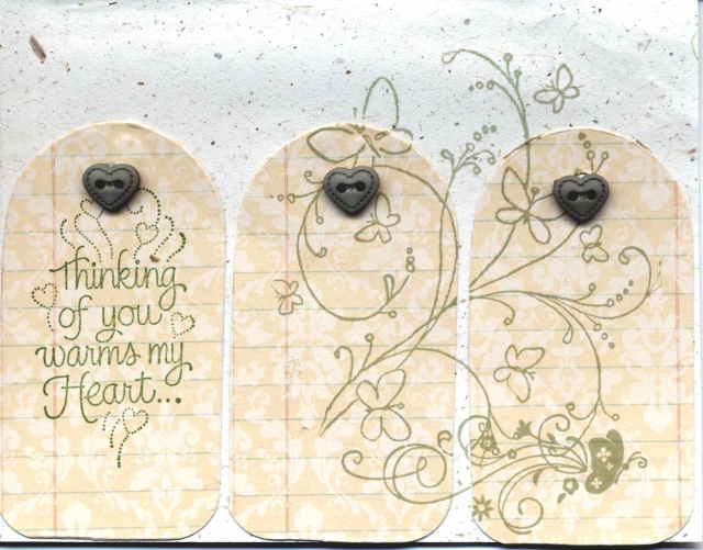 Got inspiration for this card somewhere on the We some time ago and really liked the use of tags on the card. This is a love card and can also be used as a Valentine. The buttons to over the punch hole are much lighter than they appear on the upload