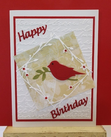 Punched bird (Stampin' Up), and die cut H.B. (Elizabeth Craft Designs) and Jasmine Frame (Memory Box). Adhered frame to patterned paper, then to embossing folder. Matted to red card stock, then to white card base. Embellished with red gems. TFL