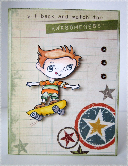 Fantastic stamping. Great composition. Your skateboarder is so cute and coloured very well.