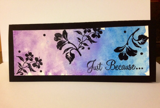 I wet a piece of watercolor paper pretty liberally and used a watercolor cake set to create the background. Once dry, I stamped my images in archival jet black ink and adhered it to a base. It's an odd shaped card but fits in a business size envelope.