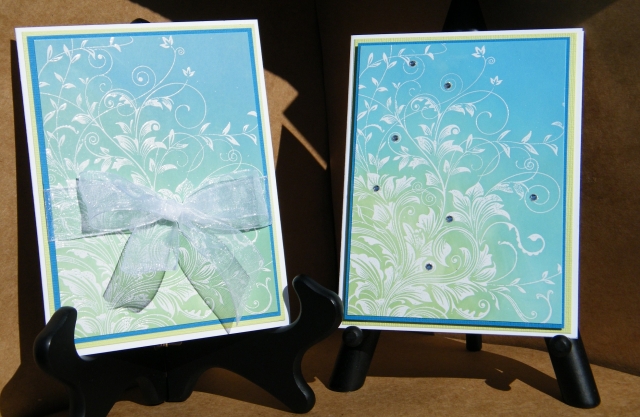 I made these cards for Heidi’s Color Theory Challenge: Analogous Colors, http://duhnproductions.com/forum/index.php?topic=520.0. I totally CASED her beautiful card (http://www.duhnproductions.com/Pics/displayimage.php?album=52&pid=916#top_display_media). Thank you, Heidi. I’ve had this stamp for a long time, and this is the first time I’ve used it.