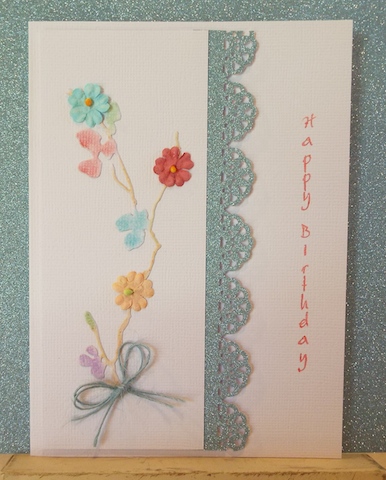 My good friend, Daria, gave me this pretty die cut, and I knew immediately that I wanted to play with it. I die cut it on white textured paper, and colored it with pastels. Embellished it with ready made flowers, and adhered to white textured panel. Added the punched border from glitter paper, and stamped quote. Panel was adhered to white textured card stock with foam tape. Embellished with blue twine bow. Thank you, Daria, for this pretty die cut!