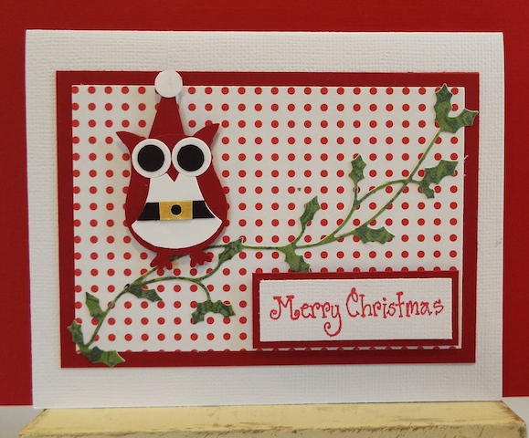 One more owl (Santa) punch card design. (Punch - Stampin" Up) (Die cut - Memory Box) Stamped quote ( Azadi Stamp Designs) Adhered to patterned paper, then matted to red CS, then to white CB.