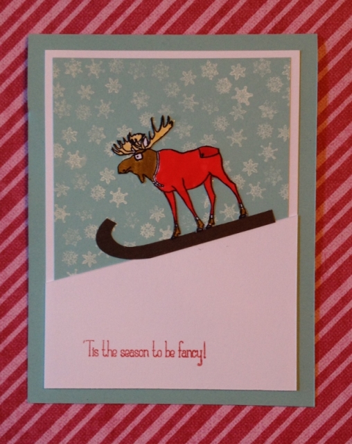 I had to buy this SU Visions of Santa set, if only for the moose! Made this with my skiing, Denver daughter in mind. Inspired by SU's Brian King (Stamp with Brian). I colored the moose with Tombows and fussy cut (maybe that's why I only made 4!). The background is stamped with a trio of snowflakes from the set, in Hero Arts Unicorn White ink. The sled was hand cut with the help of an oval punch just for the front curve. In order for the card to be fancy, I misted the whole thing with Radiant Rain shimmer mist. TFL!