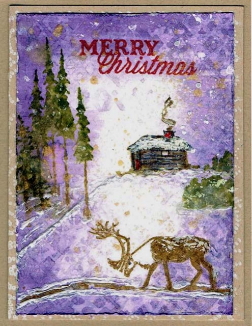 I made this card to say Happy Holidays to all my stamping friends. The card's background is water stamped with a HA diamond background stamp. Watercoloring with distress inks adds layers to the stamped images. Splattered acrylic ink, gold lame spray, icy white pearl pen and distressed edges create lots of added dimension.