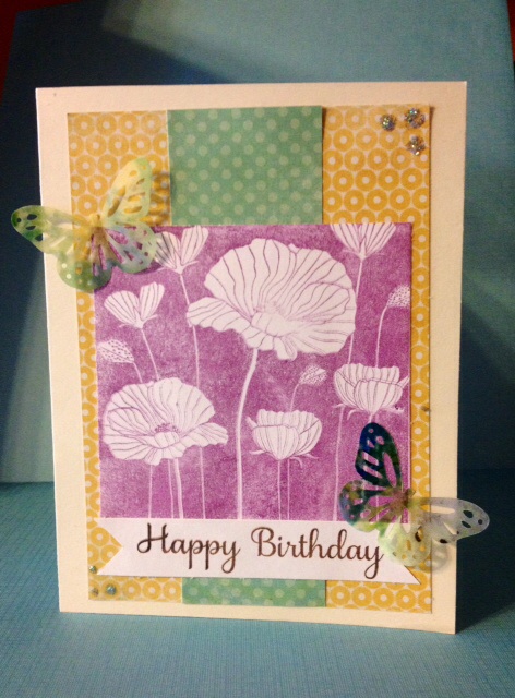I stamped my image with some lavendar pigment ink from Stampabilities. Adhered to pp and card base. Added some dots to the corners of the card with stickles.