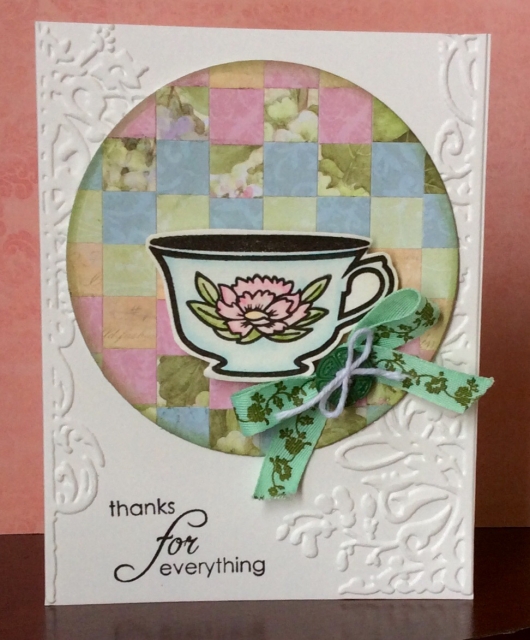 Love the soft colors on this! The embossed frame around the card is really pretty. Love the coloring on the tea cup Smile