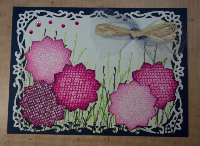 I inked up the paper towel using distress inks and then die-cut out the flower shapes. I stamped grass in the BG with green shades of pigment inks and distress inks and black distress ink. I added the ribbon and inked the beige tulle to color it blue and glued on, then added the pink bling. and added the entire thing to the blue BG.