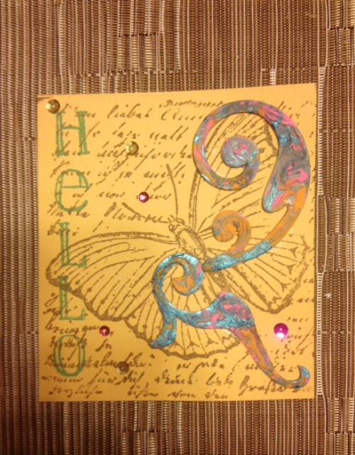 Made a 5x5 card base out do yellow cs. Using chestnut roan chalk ink, I stamped my butterfly image. Stamped the hello put with some alpha stamps(making memories, I think!) with teal pigment ink from Stampabilities. Once dry, I added my chipboard pieces along with some sequins. TFL :)