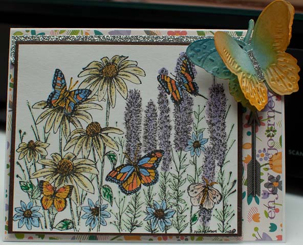 I made this card from the kit I received from SWLady. The image, the silver strip, and the background paper is from the kit. I colored the flowers with distress markers. The butterfly is colored with distress ink. I put a piece of plain brown card stock behind the image to make it pop. The saying is enjoy the journey.