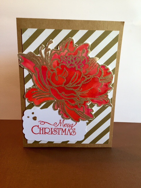 Heat embossed floral stamp(stampendous) with recollections EP in platinum. Colored it with distress inks in abandoned coral and festive berries. The sentiment is stamped in red ink from Ranger(Jenni Bowlin cough syrup) I added a few gold dots with stickers to the sentiment. PP is from an old SSS kit that I wish I had more of! I can't find the brand of it :(