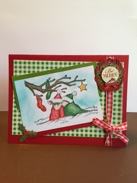 Clored image with prismacolor pencils, distress ink in tumbled glass for the sky. PP, ribbon and holly sticker is from the paper studio. Be Merry sticker is from K & Co. TFl :)