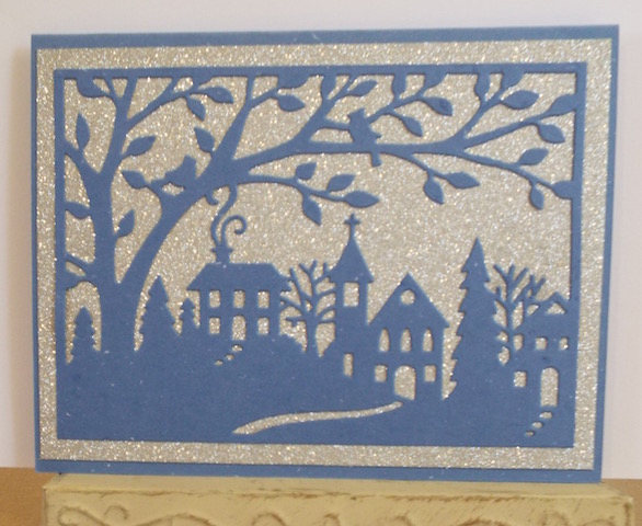 Die cut image(Cottage Cutz) on blue paper, then adhered to silver glitter paper. Matted to same blue CS. TFL