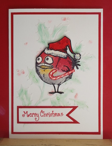 Stamped and watercolored Tim Holtz Crazy Bird image, and adhered the hat and candy cane accessories. Applied stickles (Star Dust) to hat trim. Stamped quote (Azadi Stamp Design) to banner. Adhered pieces to dry embossed piece that was colored with pastels. Matted to red CS, then to white card base. TFL