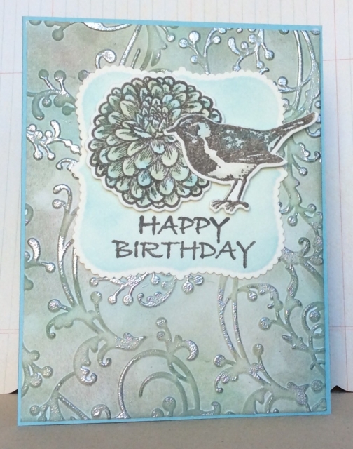Stamped bird and flower (Gina K Birthday Essentials Stamp TV kit) with Versafine grey ink and die cut them out. Watercolored with the Distress inks in Tumbled Glass and Bundled Sage.