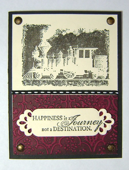 I am always in need of male cards, so I made one for this challenge. I inked up an embossing folder using black ink, put burgundy card stock in the folder and ran it through for my embossed piece at the bottom. I used a train stamp I have had forever and never used!