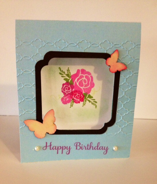 I used a spellbinders die to cut an opening in my card base and to also cut a frame for the outside of my window. I embossed the outside of the card with an EF from cuttlebug.