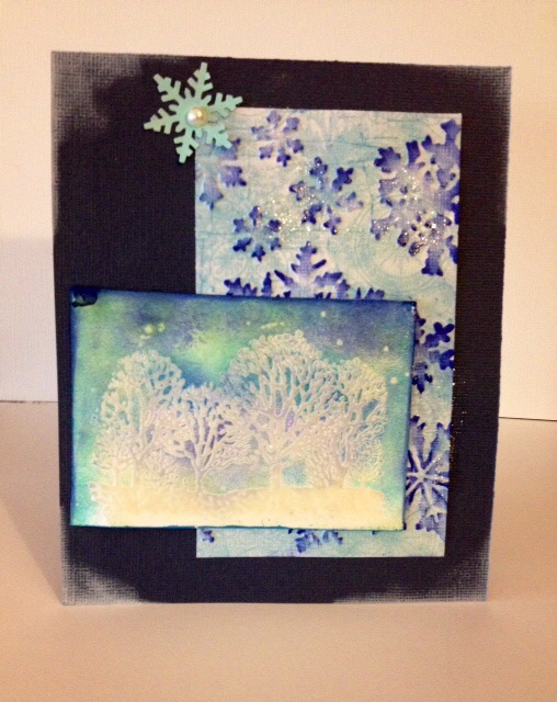 I heat embossed my image(I think it's imkadinkado? No label on it) on to white cardstock with UTEE embossing powder. Blended distress inks in broken China, tumbled glass and salty ocean. It ended up being more blue green than I wanted so I blended white pigment ink from colorbox on to the top with a sponge. I added some royal blue ink to the edges of the piece and blended that around. Next I added a piece of light blue pp that I embossed with a Tim Holtz snowflake EF. I rubbed the same blue ink, mama elephant stargazer over the raised area. Mounted the 2 to a slate/navy blue card base and inked around the edges of that with colorbox frost white ink. Added a punched snowflake to the top and brushed some clear rock candy stickles around the embossed piece.