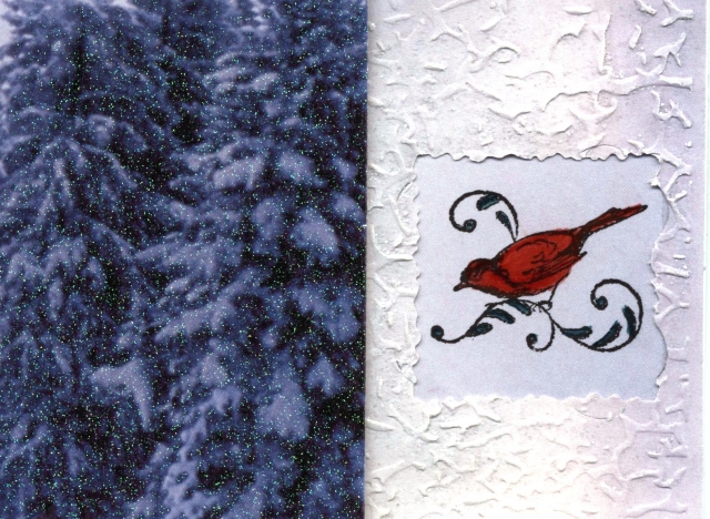 Used sparkle tree patteren paper for full panel. Embossed 2nd panel and rubbed with Distress Stickles third panel was cut with die cut and a red bird stamped inside the die cut.