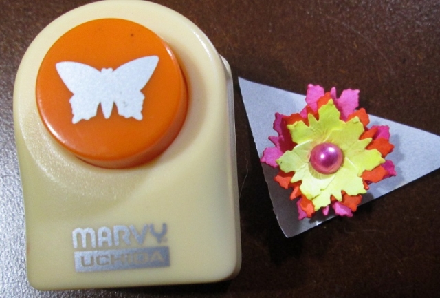 I punched a dozen butterflies and colored them with Distress Ink with Picked Raspberries, Squeezed Lemonade, and Ripe Persimmon. I used a 3D glue dot to create the flower. I colored a pearl with Bic markers for the center.