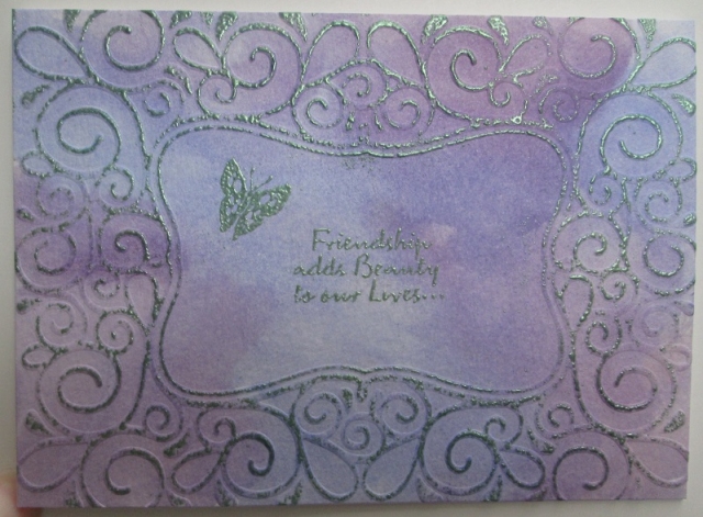 You can see the green embossing powder better in this picture. The butterfly is by Inkadinakdo and the sentiment is by Stampendous.
