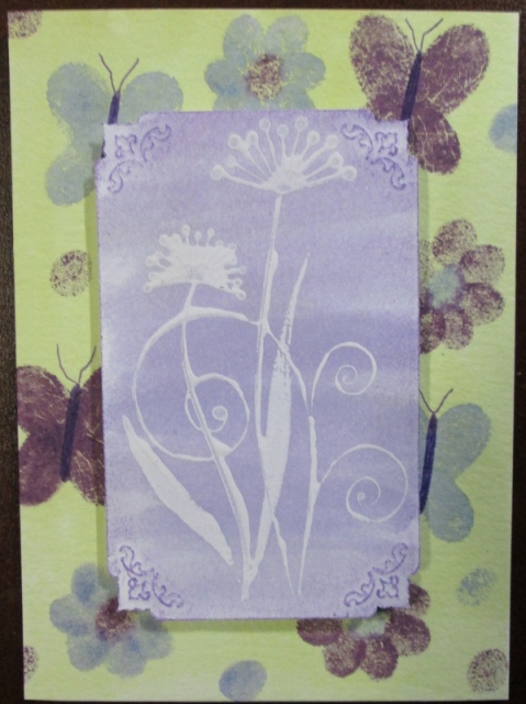 This piece is the best of the gesso resist pieces. I actually stamped it a week ago and left it alone until today. I used Distress Inks in Shaded Lilac and Dusty Concord. I used a FIskar embossing punch on the corners and then added some silver gelato with my finger to highlight the embossing.