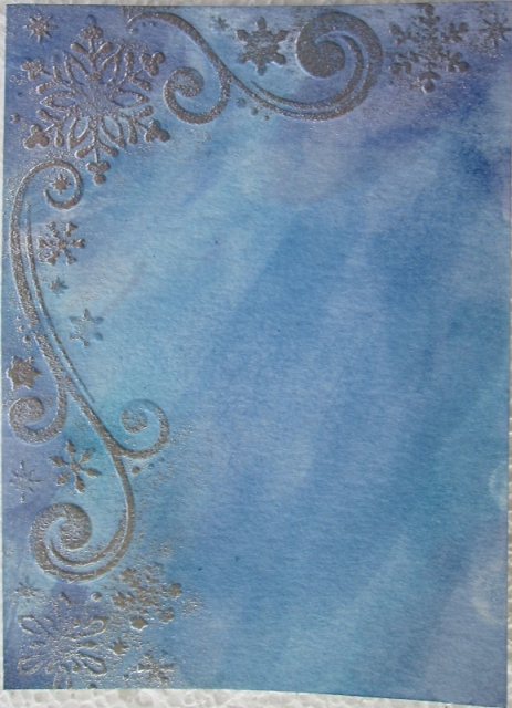 I used Distress Inks in Chipped Sapphire, Faded Jeans and Tumbled Glass for the base. The embossing folder is by Darice. This is another one that I had to clean off some of the powder before heating. I used a silver embossing powder.