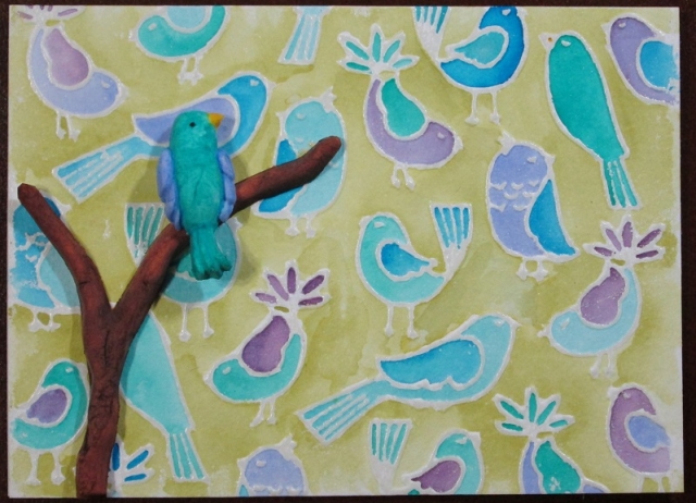 The embossing folder is by Darice. I colored the birds with Distress Ink in Tumbled Glass, Salty Ocean, Peacock Feather, Dusty Concord and Shaded Lilac. I used Shabby Shutters for the background. To finish the card off, I added the branch and bird made from air dry clay. I colored them with Distress Ink in Peacock Feather, Shaded Lilac, Mustard Seed, Black Soot and Vintage Photo.