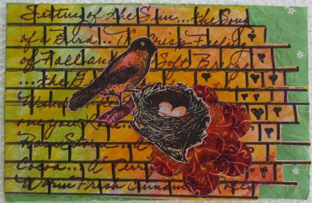 This is lovely. I like the bird and nest in front of the wall. I wonder how the flower was made?.