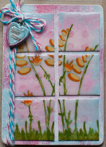 I painted th background with Paper Artsy Chalk Acrylic paints using a stencil and a background stamp. Then I stamped the flowers and painted them using the same paints. I then cut the image into tiles and put Glossy Accents on each tile. I made the actual ATC using the same paint and background flower stamp. I used twine on the left hand side and a Tim Holtz heart that says "Heart Songs".
