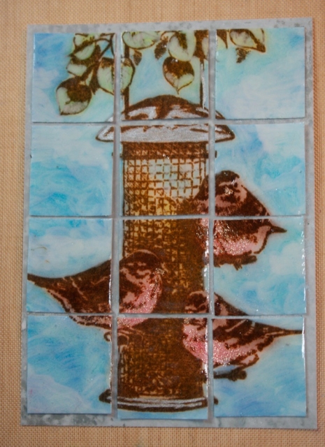 I colored the image with chalk. I added silver to the bird feeder with my sakura silver gel pen and also added clear sparkle to birds and orange sparkle to their beaks with Sakura pen. I then used my Faber-Castell white India ink PITT pen to blend the sky. Added Glossy accent to tiles; dry; adhere to BG.