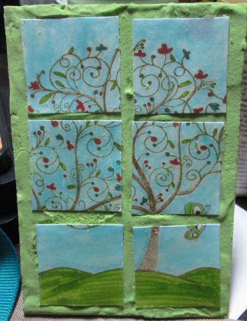 The tree is by Technique Tuesday. I stamped it with Stazon and colored it with my Farber Castell India Ink pens. I cut the image into tiles and then covered them with glossy accents.