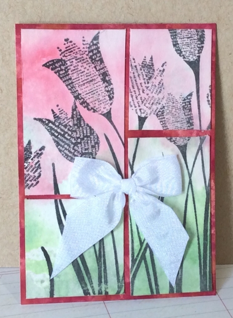 I stamped the Hero Arts newspring tulip stamp onto watercolor paper and then I used distress inks with perfect pearl added to color the background. I had trouble deciding how to cut it up, being such a small size. I decided to just cut into 4 uneven pieces.