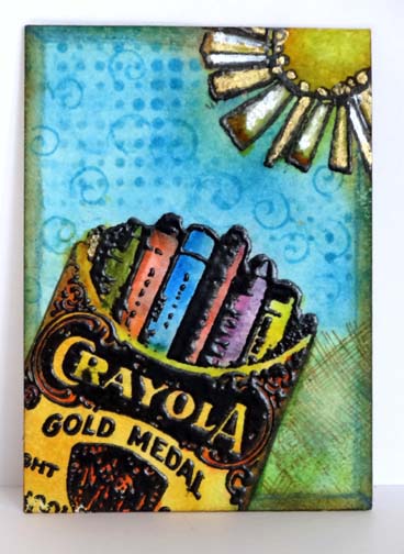 My stamp of a box of crayons seemed to be a fun focal point for Daniel’s ATC. The stamp called out for a resist technique to color the thin lines of detail.